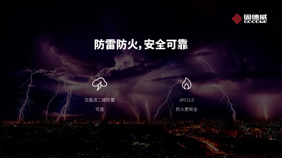 由于戶用光伏電站大多是安裝在家庭的屋頂上的,所以電站的安全變成了頭等大事,一但發生事故后果不堪設想。為保障客戶生命財產安全,固德威在設備安全方面做了頗多付出,現在已經開發出AFCI2.0(直流拉弧檢測),25kW機型可以加裝選配,直流拉弧檢測不誤報、不漏報,幾乎100%保障直流側安全。另外,25kW機型在直流側和交流測都有防雷設置,杜絕雷擊隱患,防雷更安心。