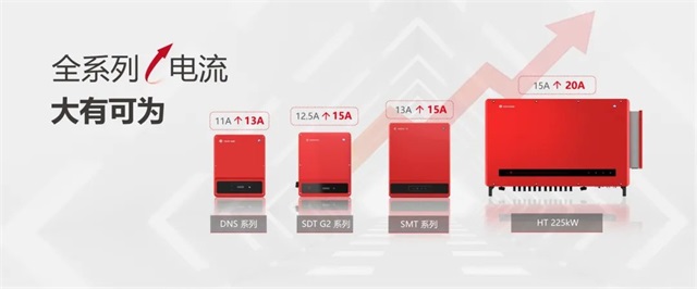 為匹配182mm/210mm大尺寸組件高功率、大電流的特性,固德威重磅新品GW225KN-HT系列,每路組串輸入電流從15A提升至20A,最大程度避免直流限發,提升系統發電量。