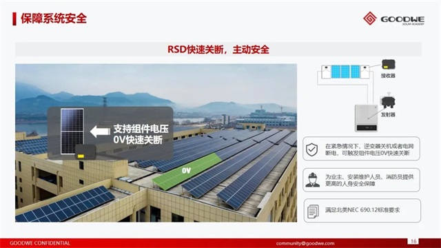 隨著分布式光伏大踏步前行,對于光伏系統的安全性也提出更高要求,固德威推出了一系列智慧安全解決方案,直流拉弧檢測技術AFCI2.0,行業領先,具有更快、更準、更廣的特點,小于0.5s快速關斷、檢測精度100%、檢測距離200m、檢測電流30A;RSD快速關斷技術,在緊急情況下,逆變器關機或者電網斷電,可觸發組件電壓0V快速關斷,為業主、安裝維護人員、消防員提供更高的人身安全保障。