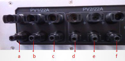 此端子是公司25KW機器,其有兩路MPPT(兩個白方框),6路直流輸入,其中a=b=c,d=e=f,但a可以不等與d。