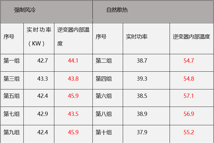 我們用固德威50KW的逆變器和其他家50KW的逆變器進行了對比,其中固德威50KW的逆變器采用強制風冷,其他廠家采用自然散熱,得出的對比如下: