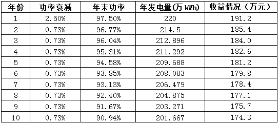 ②假設光伏的電60%被工廠消納,當地脫硫煤電價為0.4155元/度,度電補貼為0.32元/度;計算可得220萬度*40%*0.7355元/度+220萬度*60%*0.9500元/度≈190.1萬元,為首年收益。