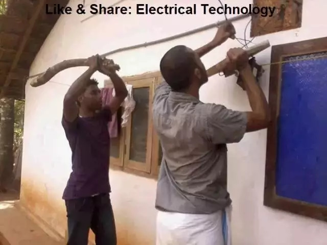 電工上場:徒手接線,萬一觸電,木棒落下可將人電分離。