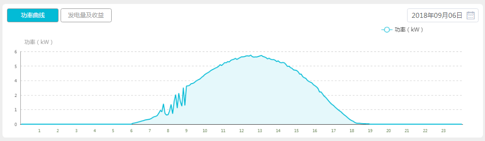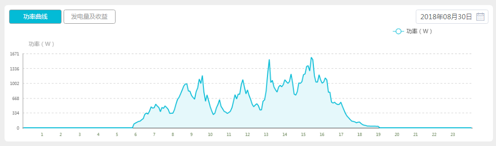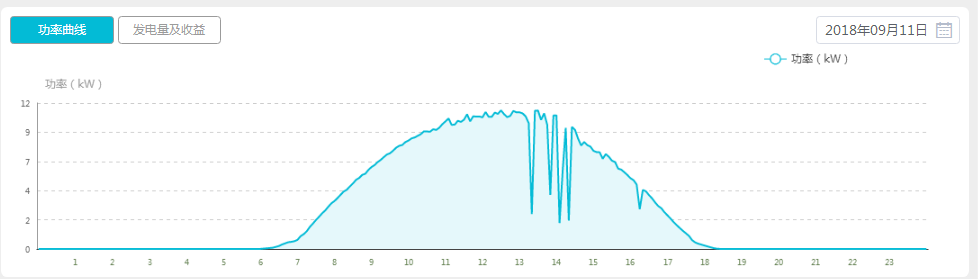 發電功率曲線圖通過記錄實時功率,繪制電站全天運行情況。也是運維人員日常關注的重點。