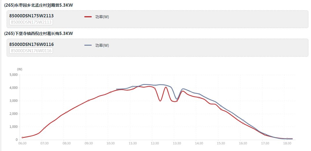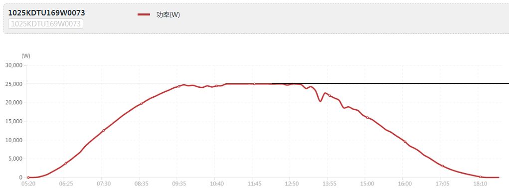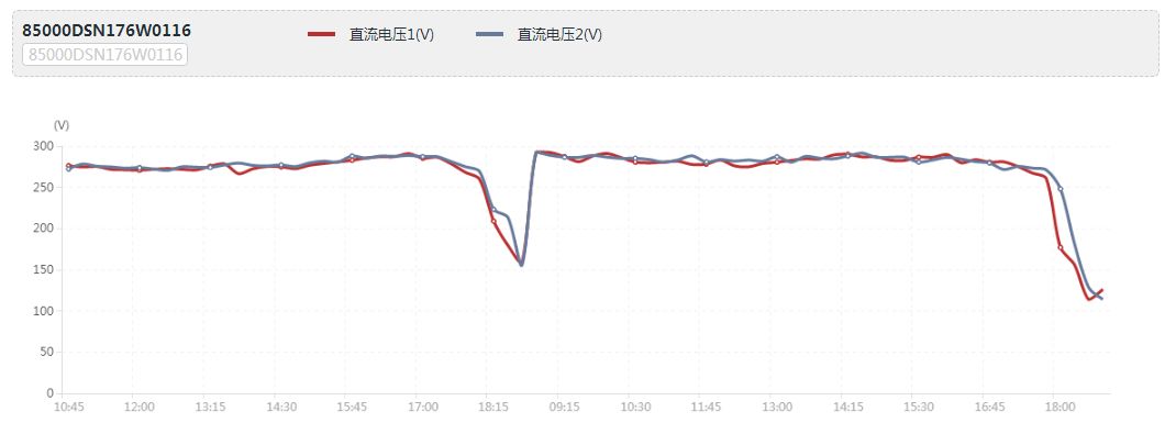 曲線跌落存在多種可能性,有可能是突然出現陰影遮擋(烏云、建筑都有可能),有一種特殊情況是中午時間段電網電壓很高,導致了并聯逆變器的其中某臺發生了降載。