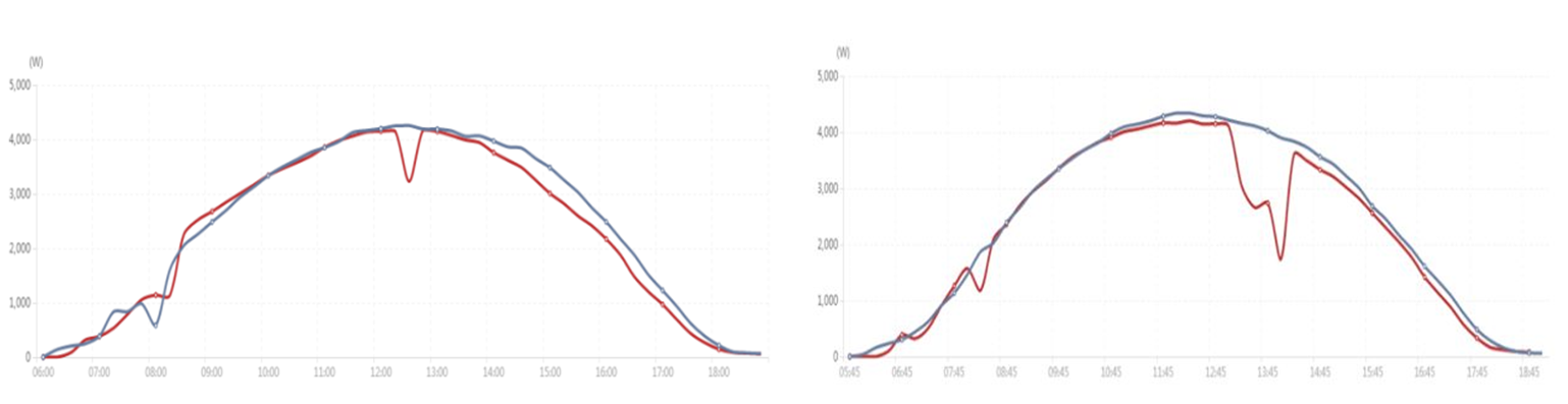 通過直流電流的對比,發現12:30-13:30這段時間其中一個電站的電流出現大的波動,經過多天發電曲線的對比,發現每到這個時刻曲線都會有一個下降。