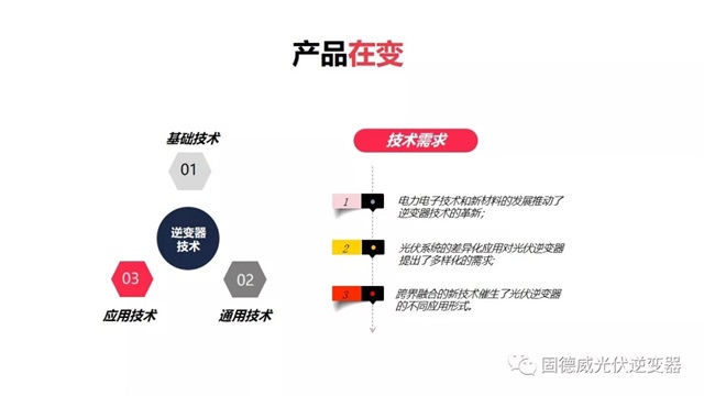 近幾年隨著電力電子技術發(fā)展,包括光伏系統差異化應用,跨界融合新技術,催生了很多應用形式。固德威緊跟技術趨勢,持續(xù)加大研發(fā)力度,通過基礎技術、通用技術和應用技術的相互組合,不斷使公司產品迭代升級,促成“產品之變”。