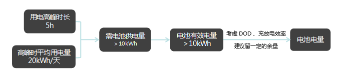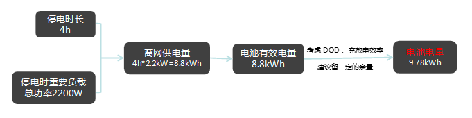 其中離網時的用電總功率和離網預計時間是最關鍵的參數。以停電預計的最長時間4小時來計算,其設計思路可參考: