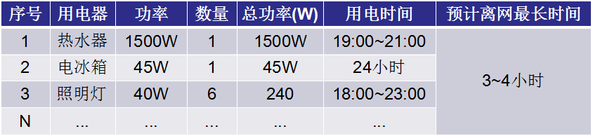 這個案例中的重要負載很單一,設計過程相對簡單。如果系統中有其他重要負載,需要全部列出(如下例)然后根據全天最長連續停電時長內最大的用電負載功率和用電量,最后確定需要的電池容量。