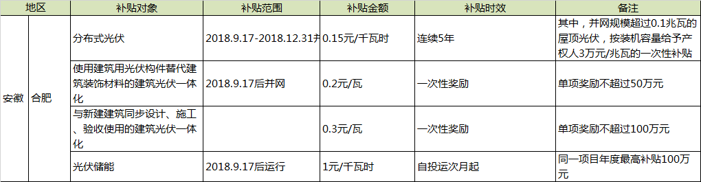 補貼對象及金額: 2018年12月31日前建成并網的分布式光伏項目,給予0.15元/千瓦時補貼,連續補貼5年。并網規模超過0.1兆瓦的屋頂光伏項目,按裝機容量給予屋頂產權人3萬元/兆瓦的一次性補貼。