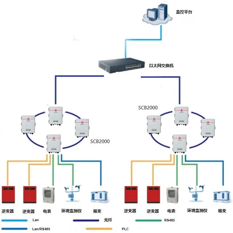 從光伏逆變器至數據采集器分別使用RS485或PLC的通訊方式,再由光纖的形式到后臺。固德威光纖環網共有兩種方案,分別對應的產品為SCB1000和SCB2000。