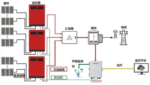 對于大型工商業和地面電站項目,逆變器和數據采集器之間一般會采用RS485、PLC的監控方式,從數采到控制室,一般會采用網線、GPRS、光纖等。