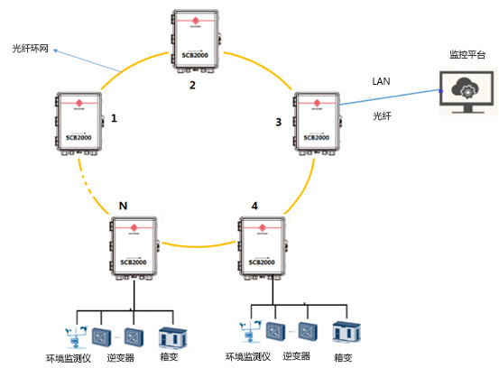 光纖環網:通過光纖把各個光伏光纖終端盒連接起來組成環網,交換機通過網線與數據采集器連接。當環網中的任一光纖出現中斷時,對于主站接收數據沒有影響,不會出現通訊斷鏈、數據丟失的情況;并且光纖的傳輸相對速率更快,傳輸距離能夠達到20km。