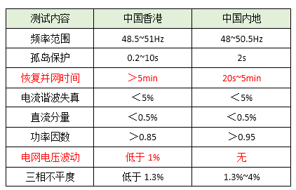 兩點比較大的差異,一個是并網恢復時間要求,香港要求更長;一個是香港地區要求電壓波動不超過1%,而內地則沒有這個要求。