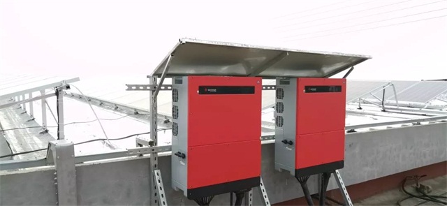 項目采用固德威GW50K-MT逆變器共2臺,逆變器采用支架安裝。在逆變器頂部安裝了遮陽擋板,可以有效避免夏季陽光直射帶來的逆變器溫度過高而降載的問題,同時延長了逆變器的使用壽命。
