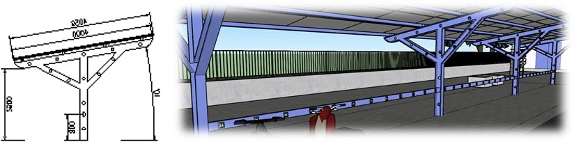 車棚采用Y型單立柱結(jié)構(gòu),形式上比T型、V型結(jié)構(gòu)上較為美觀,且適合布置充電插座,組件還采用了透明的背板,更加突出了車棚美觀的效果;