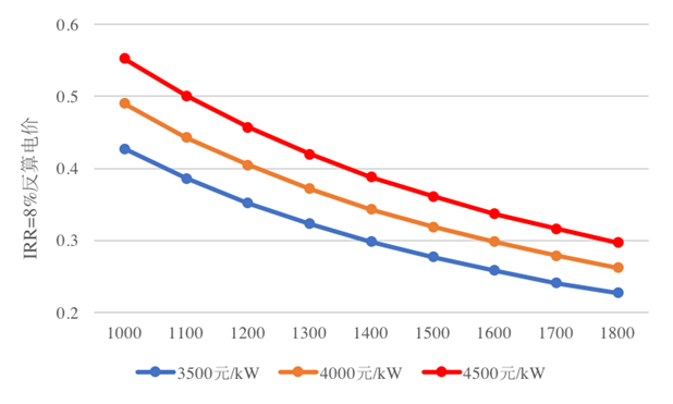 不同投資水平下,各資源區項目IRR=8%時的反算電價