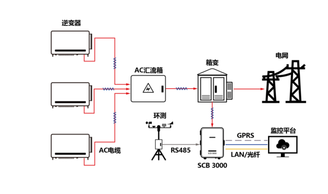 組網(wǎng)形式:逆變器通常帶有2個RS485接口,通過手拉手的形式,由末端逆變器接數(shù)采裝置,數(shù)采裝置通過LAN、GPRS或光纖等形式送到監(jiān)控后臺。如圖所示: