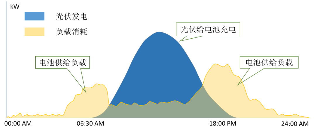 此應用場景旨在提高光伏系統的自發自用率:當光伏系統發電量充足時,生產的電能將優先供給負載,多余部分存儲在電池中,以便在光伏系統發電不足時通過電池放電滿足負載需求。以此為目的設計儲能系統時,需要關注每日家庭用電的總量,以確保光伏發電量能夠滿足用電需求。