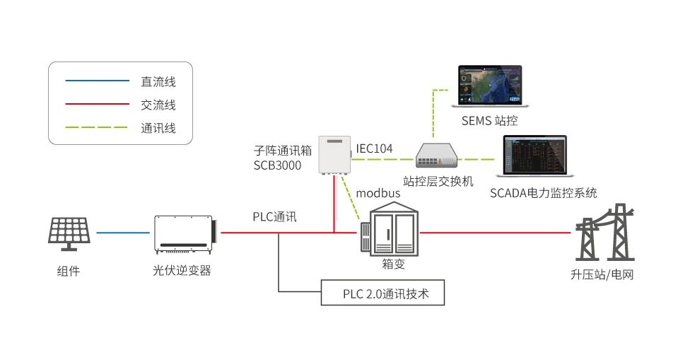 SCB2000和SCB3000通訊箱既可以使用RS485串口通訊方式可以使用PLC通訊方式,其中SCB3000的PLC通訊帶寬較SCB2000提高了一倍,最大可接入60逆變器,也可提供4個串口和1個LAN口,可接入友商逆變器、箱變測控、電度表、環境監測儀等采用標準modbus協議的第三方設備。LAN口負責將數據通過IEC104協議傳輸至站控系統和SCADA系統。