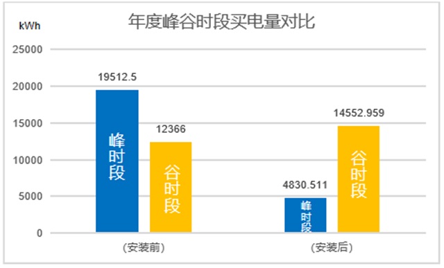 安裝光儲后:只需從電網(wǎng)買19,383度電(峰段4, 830度電,谷段14,552度電)年電費9,100 元