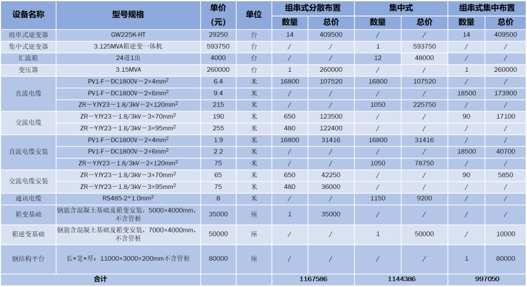 在地面電站中,現階段主流機型位225kW組串式逆變器和3125kW集中式逆變器,組串式逆變器的單價略高于集中式逆變器,但是采用組串式逆變器集中化布置的優化方案,可以有效減少交流電纜的使用量,減少的交流電纜量完全可以抵消組串式和集中式逆變器的差價,見下表成本分析。