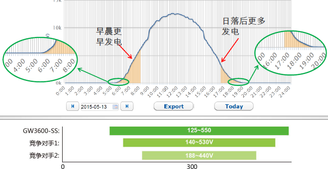 更寬的MPPT電壓范圍能夠實現早晨更早發電,日落后更多發電。