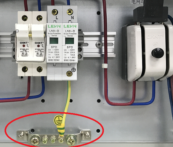 交流側防雷保護一般由熔斷器或斷路器和防雷浪涌保護器構成,主要對感應雷電或直接雷或其他瞬時過壓的電涌進行保護,SPD的下端接到配電箱的接地排上,如下圖所示。