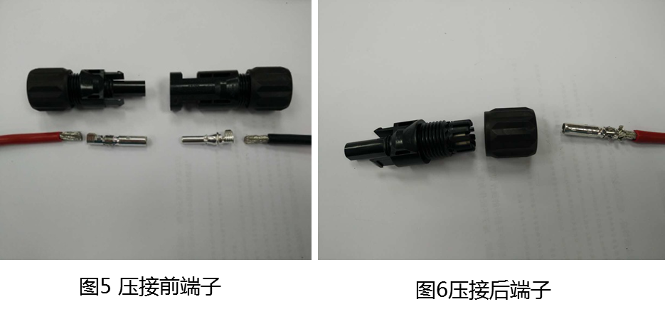 組件插入到逆變器直流側的端子必須使用我司附件盒中標配的端子連接,端子內部金屬部分要用接線鉗卡牢,組件輸出端子和逆變器的端子必須接觸牢固,不松動。
