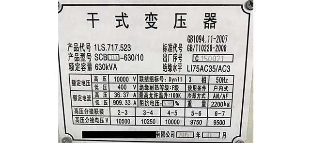 例如上文中的干式變壓器銘牌型號(hào)為SCB10-630/10;SC表示三相固體成型(環(huán)氧澆注),10表示性能水平,數(shù)字越大,表示損耗越小,節(jié)能效果越好。630表示變壓器容量為630KVA,10表示變壓器一次側(cè)電壓為10KV。
