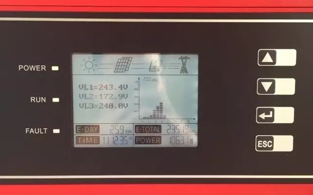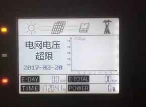 逆變器交流側(cè)顯示電壓為VL1=243.4V、VL2=172.9V、VL3=248.0V,明顯第二相電壓異于正常值;關(guān)閉逆變器,測(cè)量配電箱電網(wǎng)電壓為VL1=238.1V, VL2=170.5V,VL3=227.5V。排除光伏的影響,確定為電網(wǎng)電壓偏低的故障。當(dāng)?shù)仉娋W(wǎng)三相極不均衡,各居民用戶在B相電網(wǎng)接入負(fù)載負(fù)荷過大,然后加劇了B相線的壓降,需要去供電局溝通處理,努力提高當(dāng)?shù)仉娋W(wǎng)質(zhì)量,并盡量保證各家庭接入電網(wǎng)的三相平衡。